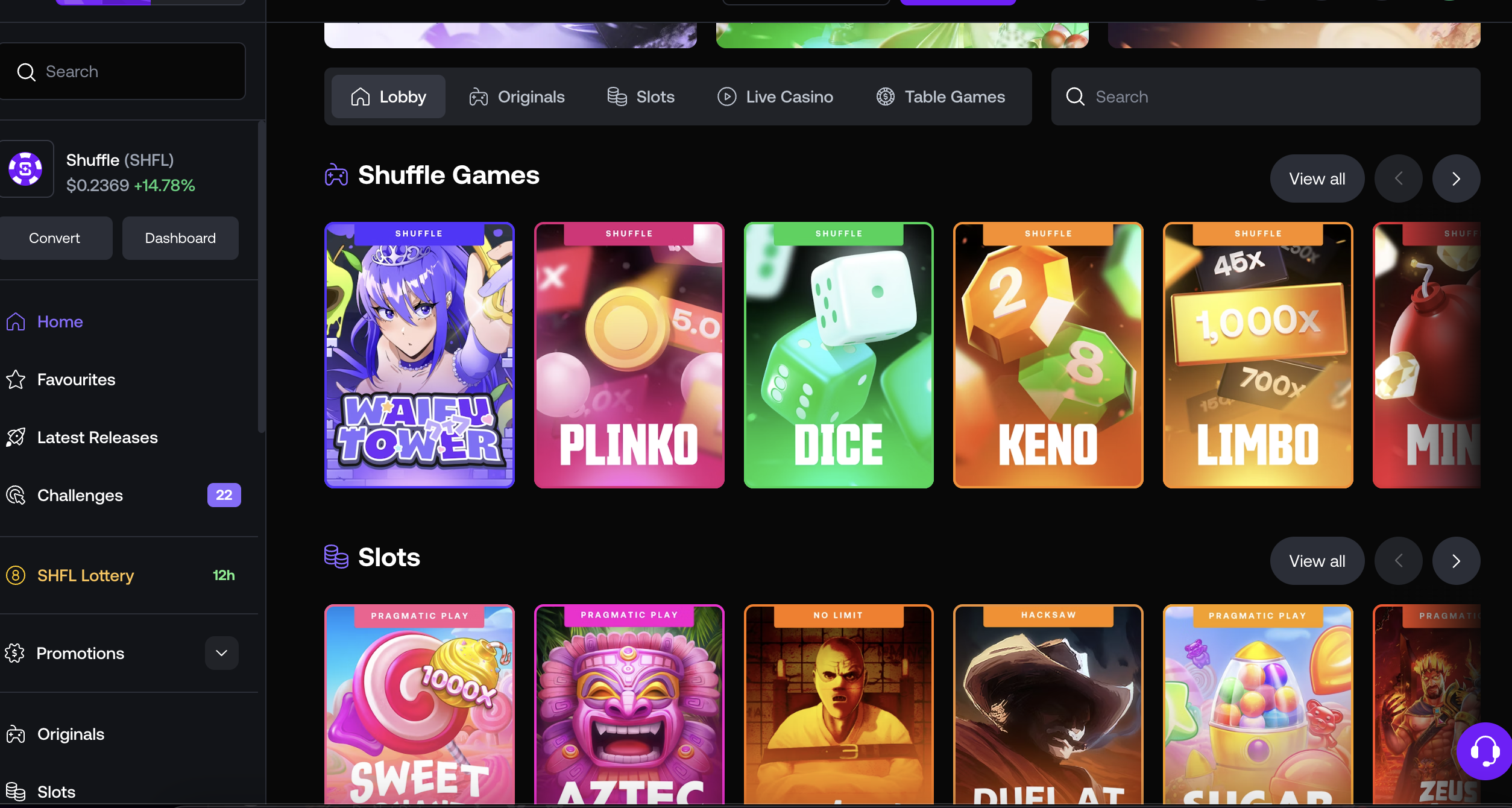 The Shuffle Casino homepage showcases a sleek and user-friendly interface.